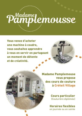 ExpérienceMadame Pamplemousse vous propose des cours de couture à son atelier à Créteil village. Couturière diplômée, je vous propose des cours particuliers et personnalisés selon votre projet, les horaires sont flexibles en journée ou en soirée. Apprenez à vous servir de votre machine ou de votre surjeteuse, à faire des vêtements, des sacs, des accessoires...