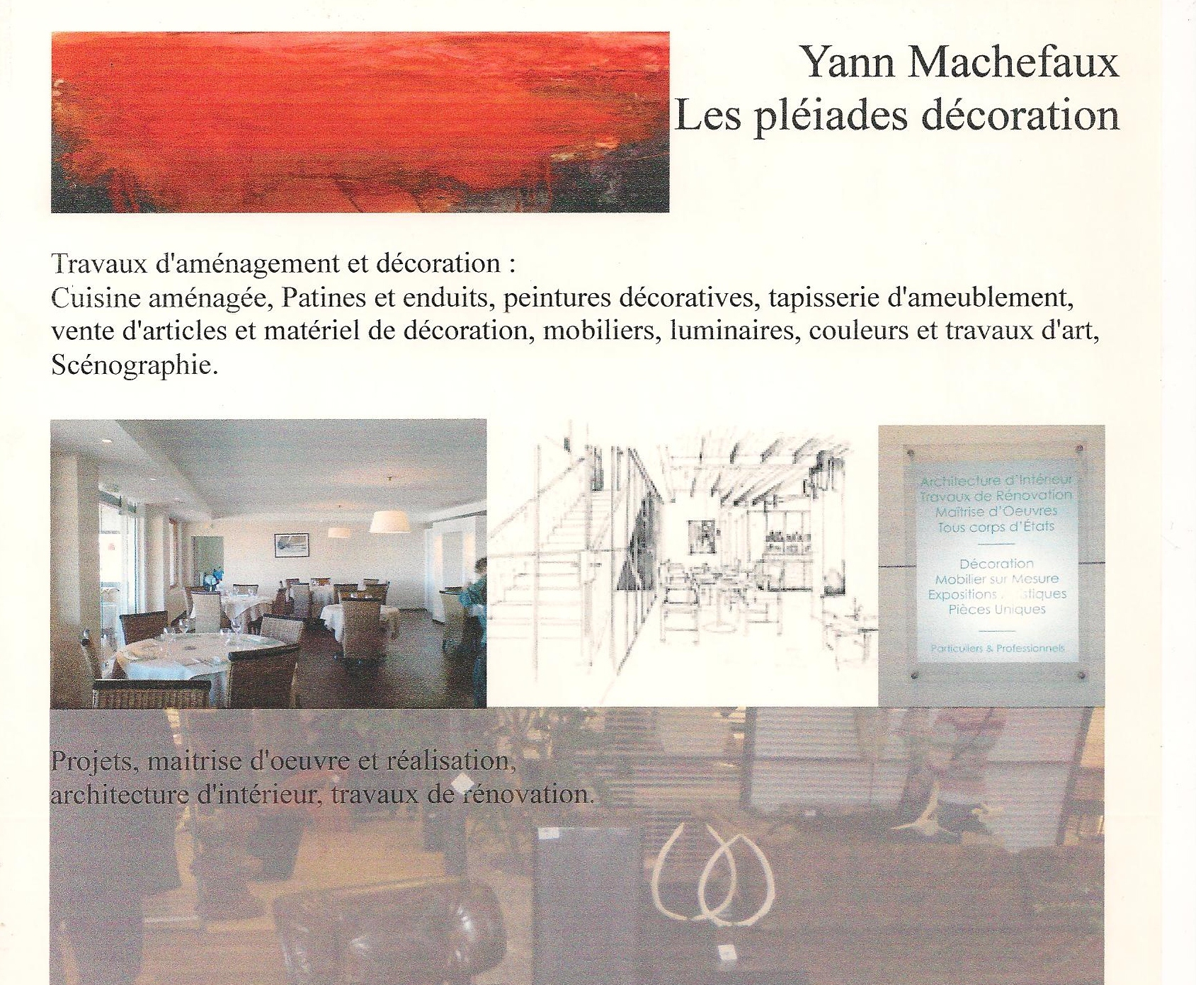 Travaux d'aménagement et décoration ; Projet, maîtrise d’œuvre et réalisation d'aménagement d'intérieur. peintures décoratives, patines et enduits, cuisines sur mesure, mobiliers, luminaires, couleurs et travaux d'art. Scénographie.