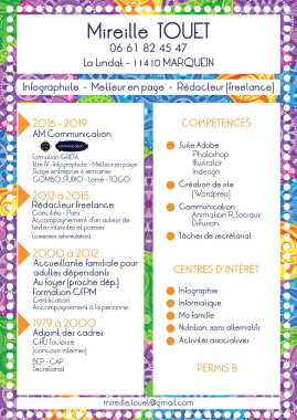 Ma maîtrise de la langue française et de l'image (PAO) me permet de répondre à vos besoins de communication avec rigueur et créativité.
