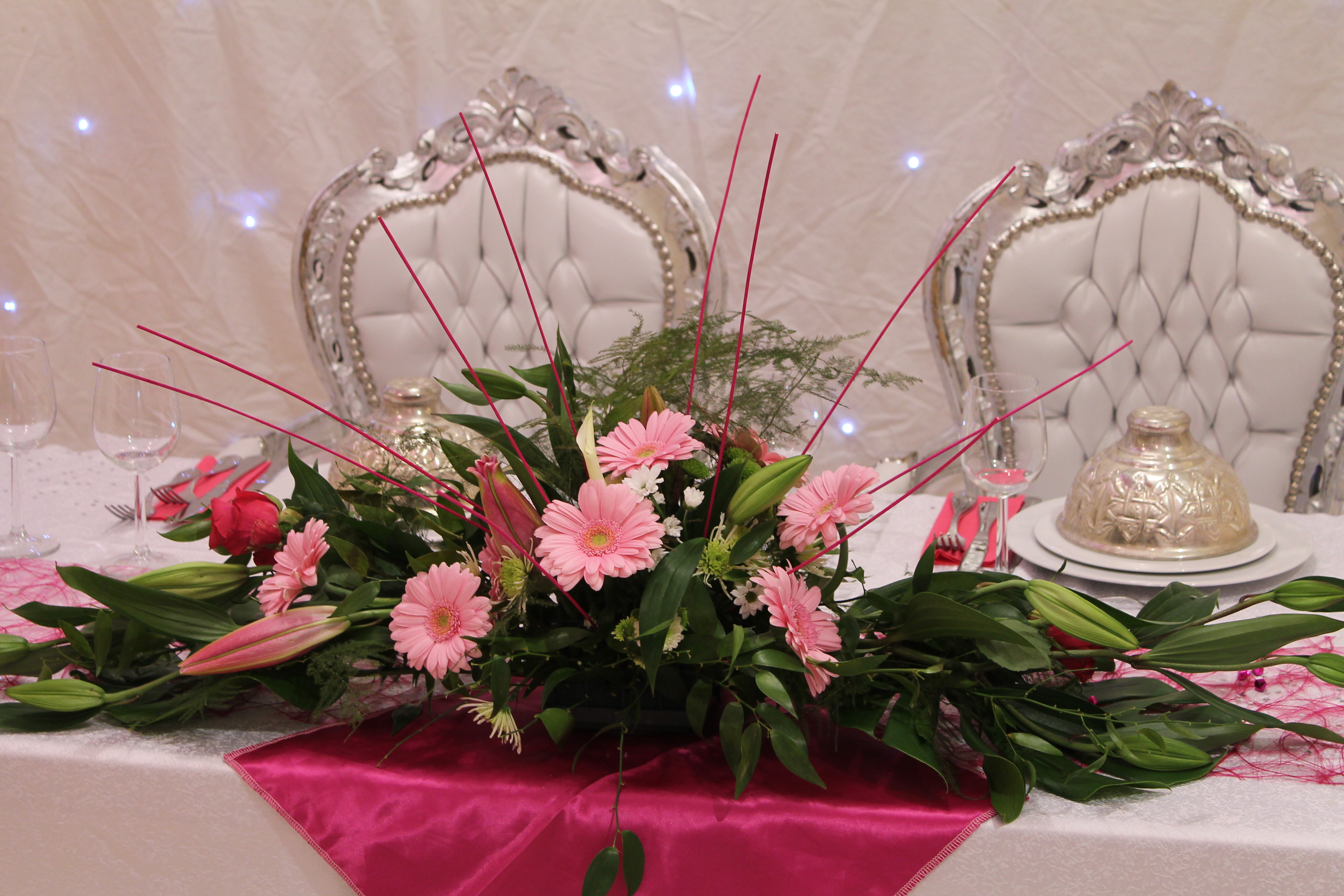 Vous me donnez votre thème, et je vous le décline dans votre décoration de salle et de table, votre repas, votre pièce montée, mais aussi votre bouquet et celui de vos témoins, sans oublier le bouquet de la voiture.